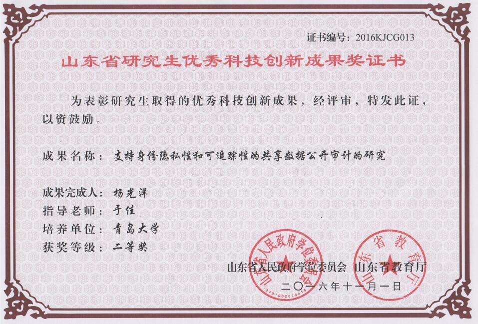 2016年山东省优秀学位论文、研究生优秀科技创新成果奖和实践成果奖评审已经结束。国产自拍av 2013级研究生杨光洋的“支持身份隐私性和可追踪性的共享数据公开审计的研究”荣获山东省研究生优秀科技创新成果二等奖,指导教师为于佳教授。