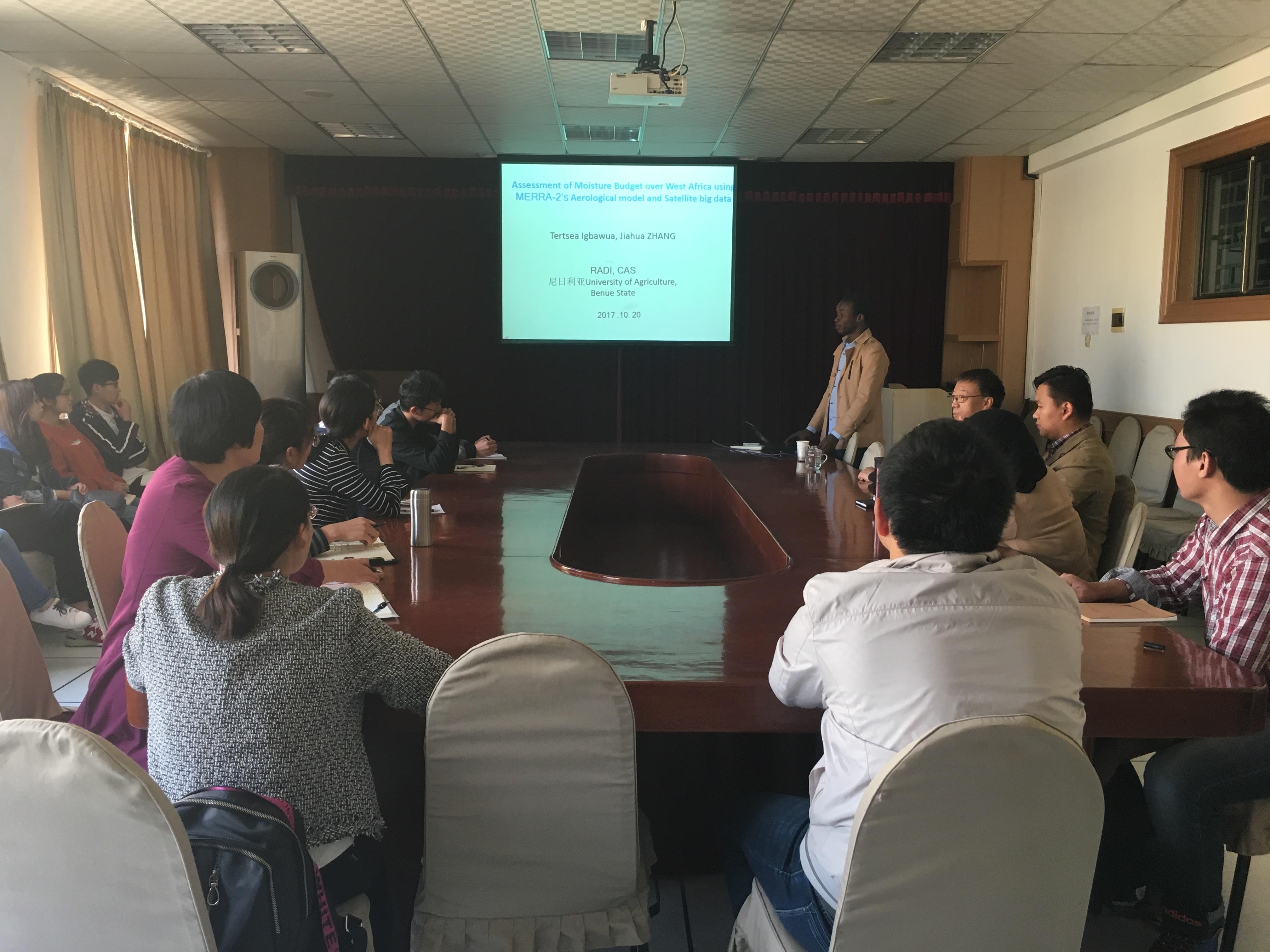 2017年10月20日下午,《遥感科学论坛》(Remote Sensing Sciences Forum)第2期在博知楼510会议室举行。本次论坛由特聘教授张佳华主持,论坛邀请了尼日利亚University of Agriculture, Benue State的IGBAWUWA Tertsea博士主讲,题目是“基于MERRA2空气动力模型和遥感大数据的西部非洲水循环评估”。共有三十余名师生聆听了本次论坛。