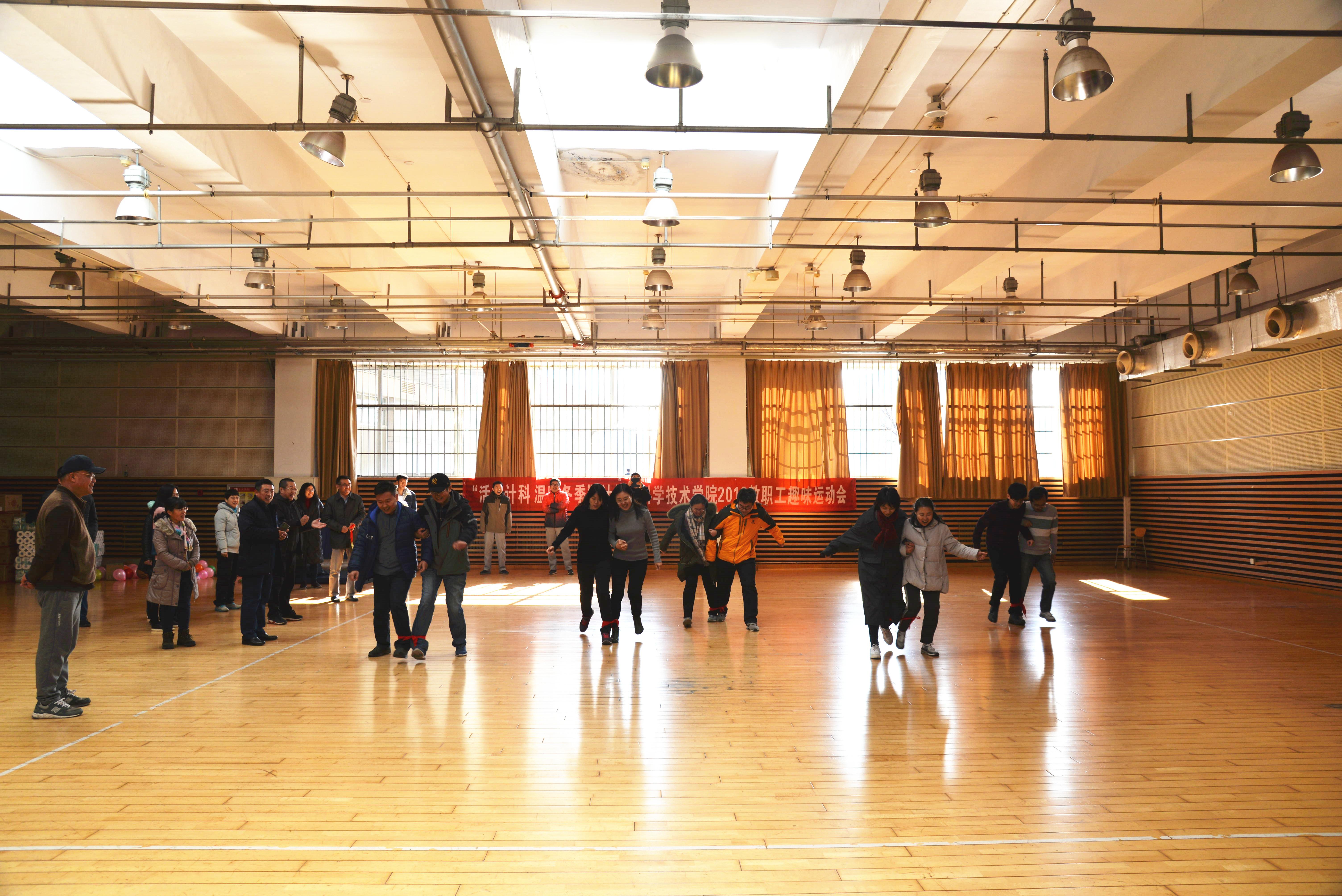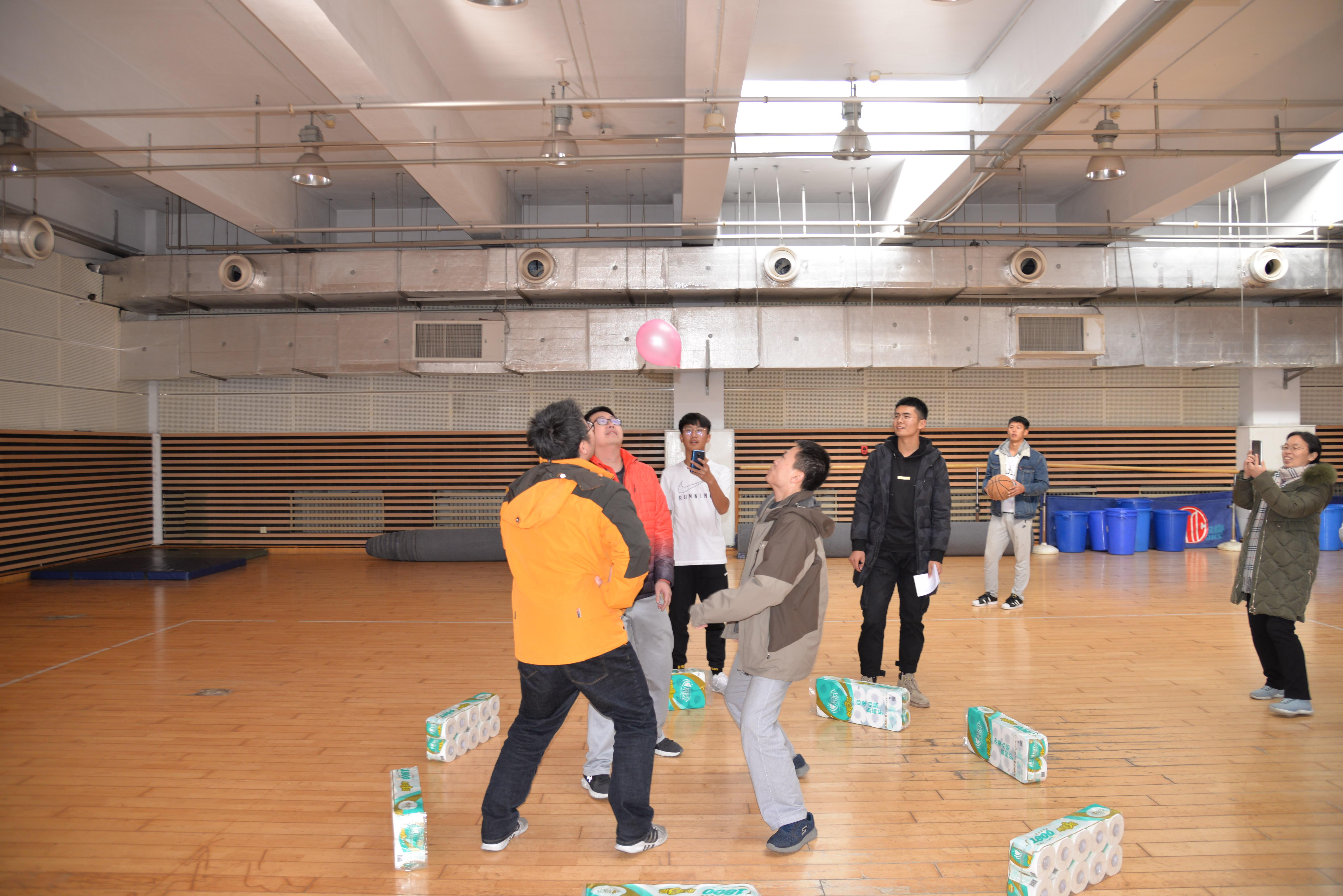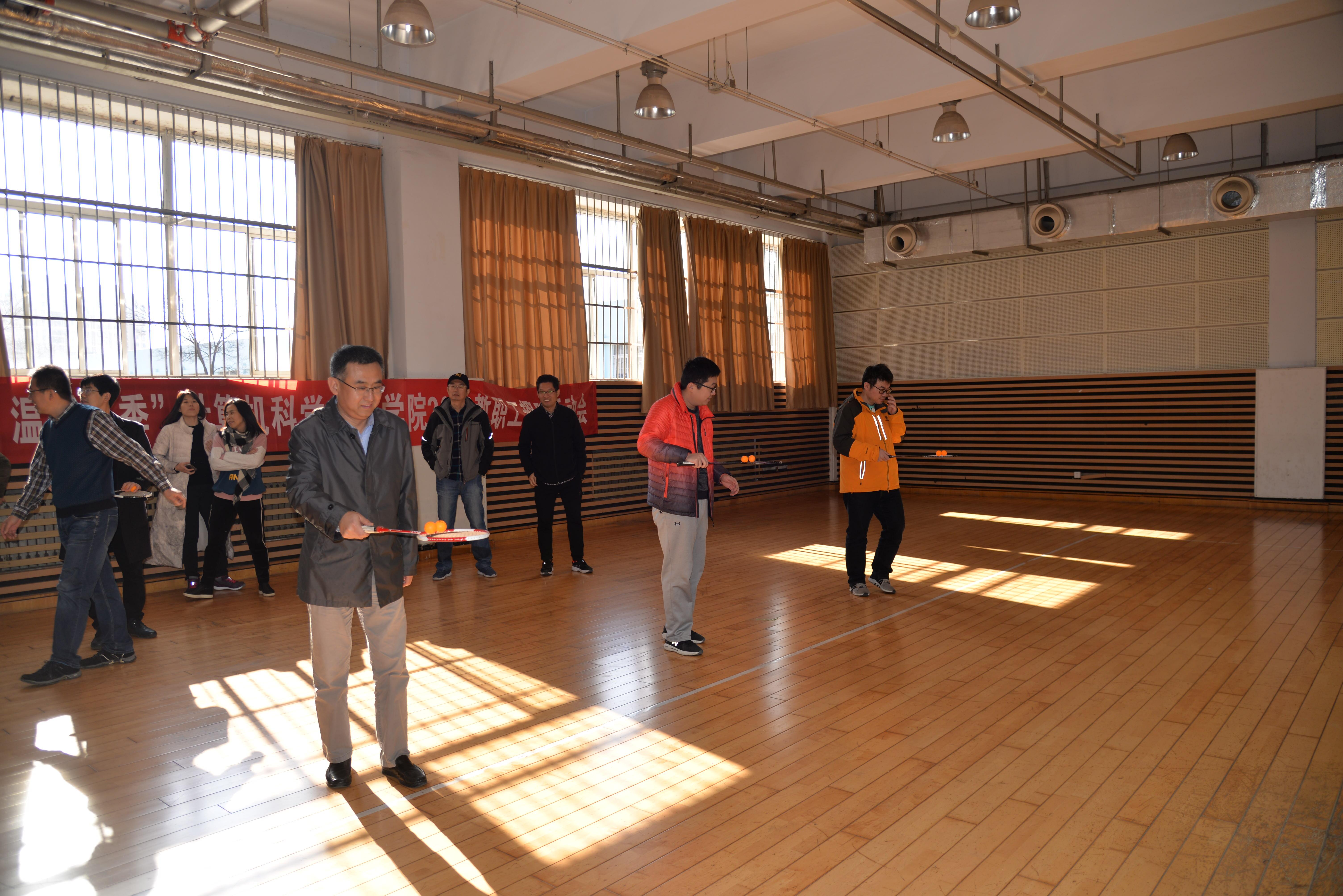 12月6日中午,国产自拍av “活力计科 温暖冬季”2019教职工趣味运动会在体育馆副馆举行。院党委书记尹增刚、副书记周鹏及50余名学院教职工共聚一堂,开展了瞎子敲锣、两人三足、托球跑、滚球击靶、吹气球等多项趣味活动。
