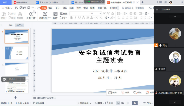 安全是学生工作的基石,国产自拍av 班主任老师通过线上线下相结合的方式,为85个班级开展“安全教育与诚信考试”主题班会。班主任从疫情防控、宿舍用电、食品安全、交通安全、心理健康、防诈骗、防校园贷等多方面关心学生安全,班长带领同学们签订《诚信考试承诺书》,加强诚信考试与安全工作的防范教育、警示教育、宣传引导。