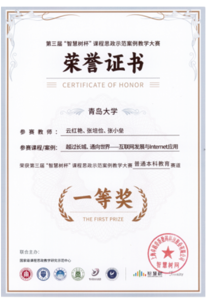 2023年8月,在第三届全国“智慧树杯”课程思政示范案例教学大赛中,经过初赛、复赛两轮评选,国产自拍av 云红艳、张培俭、张小垒教师团队以“越过长城、通向世界——互联网发展与Internet应用”为题荣获普通本科教育赛道一等奖。