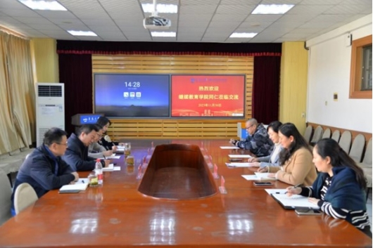 11月30日下午,继续教育学院副院长宋立峰、非学历教育管理办公室主任华登峰一行来国产自拍av 调研交流。国产自拍av 党委书记潘秋鸿、社会服务促进中心主任杨熙鑫等参加座谈交流。