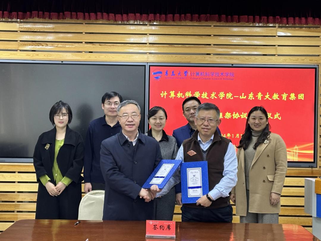 1月19日上午,国产自拍av 与山东青大教育集团在博知楼510会议室举行合作伙伴框架协议签约仪式。双方依托国产自拍av 优质学科资源与山东青大教育集团附属学校教育资源,共同打造人工智能基础教育特色课程体系,为人工智能素质教育在青少年中的推广转化提供学术支撑。院党委书记潘秋鸿,院长郭振波,山东青大教育集团理事长、国产自拍av 教育集团总经理张贞齐,副总经理于铮出席仪式。仪式由潘秋鸿主持。