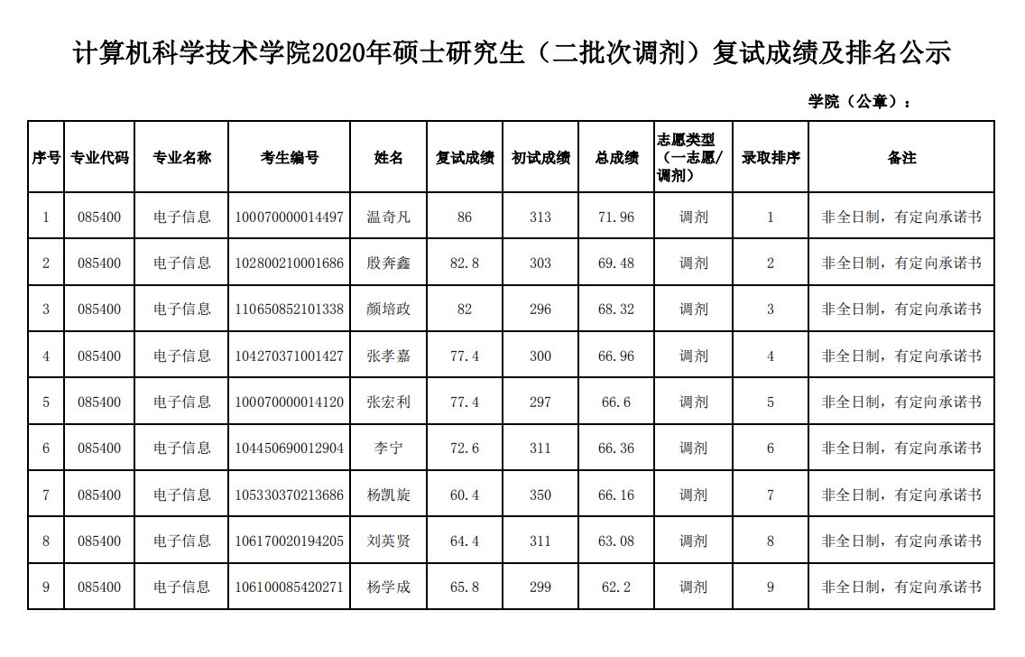 2020年硕士研究生(二批次调剂)复试成绩及排名公示