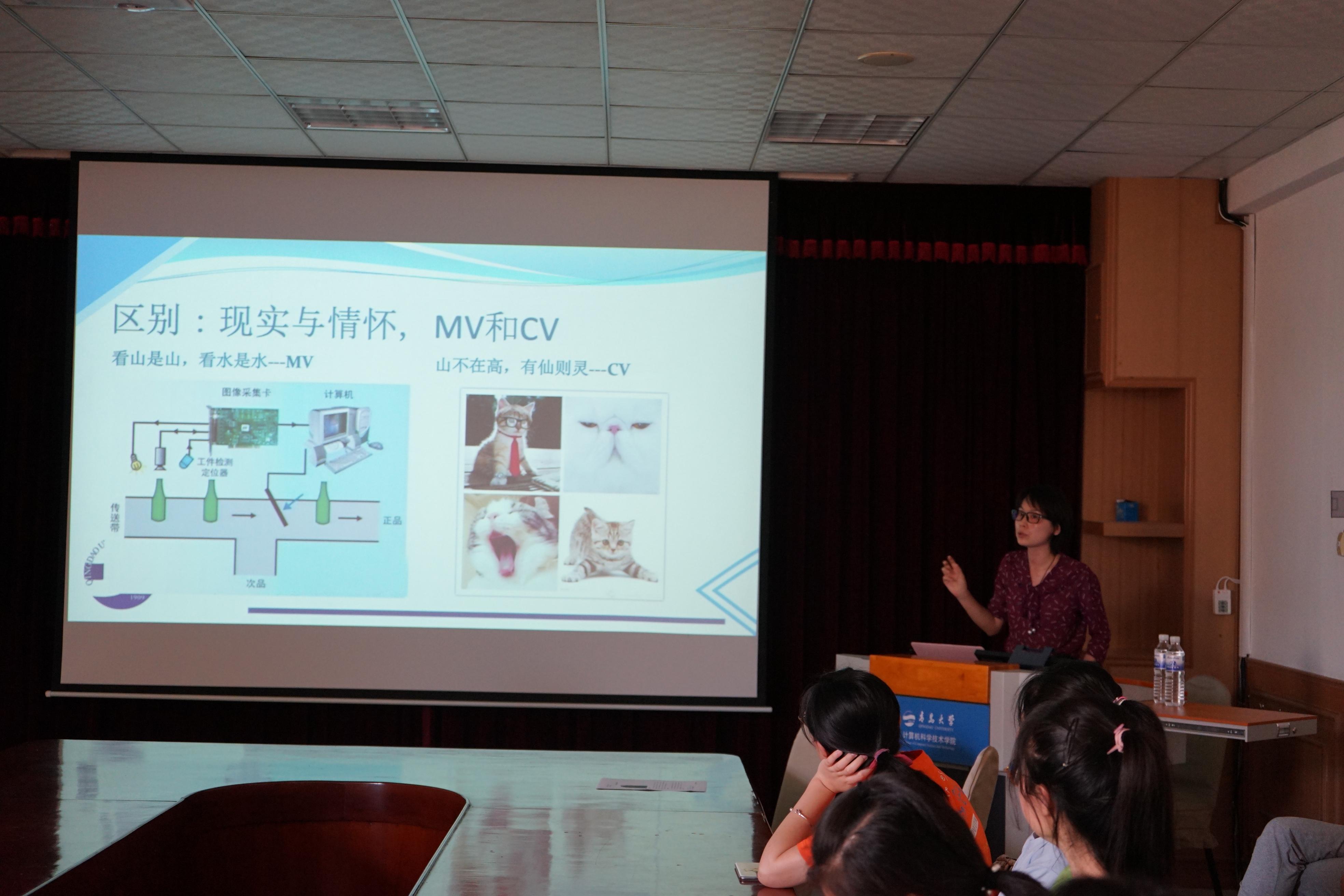 报告中,郭莉首先介绍了计算机视觉这一概念,她表示,作为一门独立学科,计算机视觉在最近几十年得到了迅速发展,已成为计算机研究领域的一门综合性的前沿交叉学科。随后郭莉围绕物体识别和检测,语义分割,运动和跟踪,视觉问答,图像描述五个部分内容对计算机视觉和其主要应用的方向进行了阐述,并对计算机视觉与图像处理的关系和计算机视觉和机器视觉的区别进行了解释。报告的最后,郭莉还为到场师生们介绍了当下计算机视觉处理的主流方法以及对未来的展望等。
