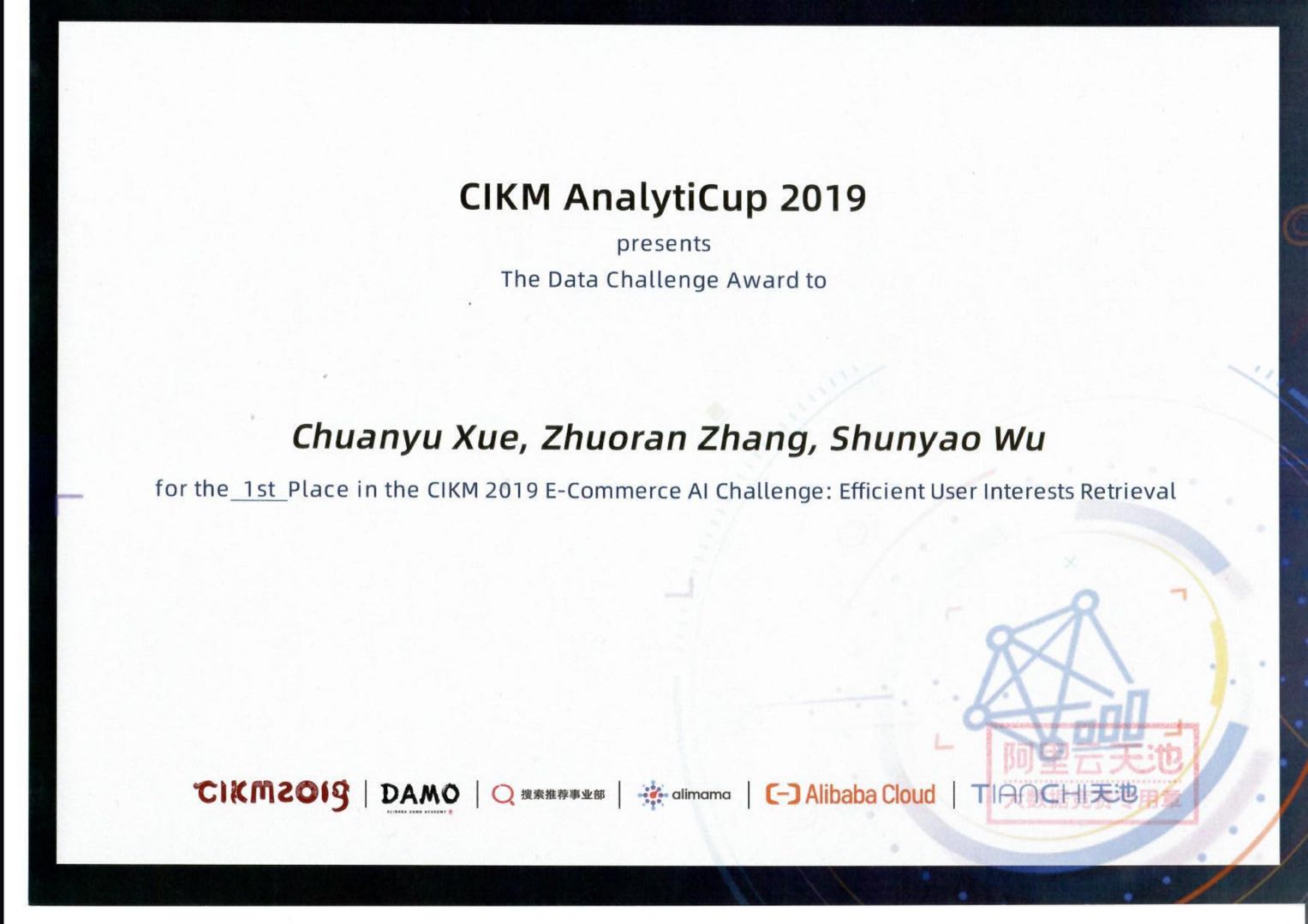 2019年11月,薛传雨和国产自拍av 青年教师吴舜尧博士及春秋航空算法工程师张卓然组成的“QDU”队伍在数据挖掘领域国际顶级会议 Conference on Information and Knowledge Management(简称CIKM,CCF B类会议)举办的“阿里电商人工智能挑战赛”“超大规模推荐之用户兴趣高效检索”赛道中取得全球第一名的佳绩,这也是国产自拍av 首次在CIKM数据挖掘比赛中获得世界冠军。