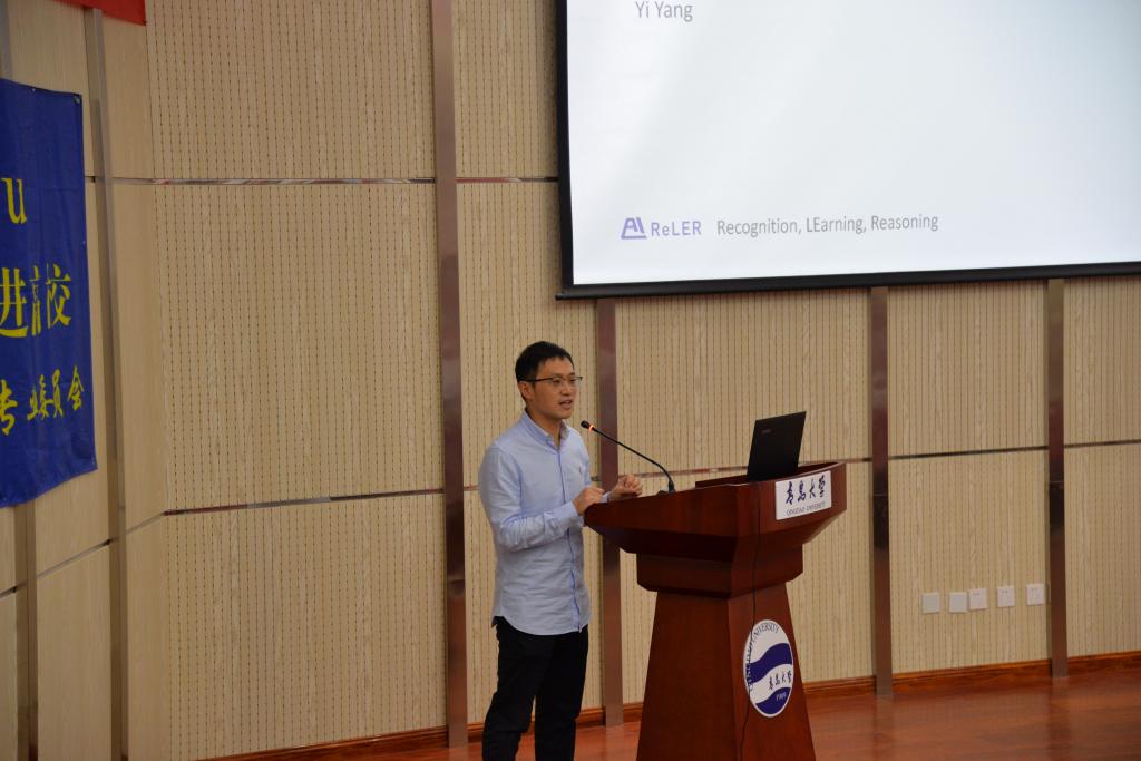 杨易教授围绕“Research on Video Analysis at the ReLER Lab”这一主题进行了报告,分享了他最近几年在跨媒体领域的主要工作。报告中,在视觉和语言的联合建模方面,杨易介绍了存在未知物体的图像描述、视觉对话、EmbodiedQA、视觉常识推理等工作;在视频分析方面,他介绍了视频特征学习、音频与图像结合的视频事件定位、多模态预训练、第一视角视频分析等工作。