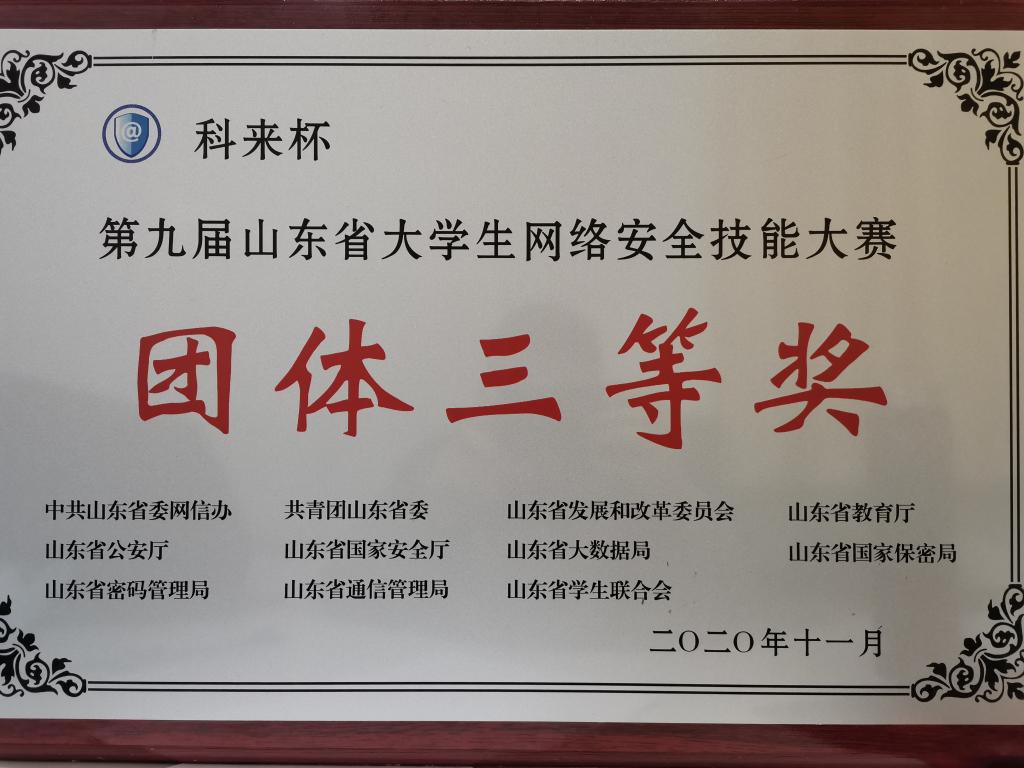 近日,“科来杯”第九届山东省网络安全技能大赛在山东大学青岛校区圆满落幕,国产自拍av 咸鹤群副教授指导的,贾广琛、程啸林、撒越洋三名学生组成的国产自拍av 代表队获得团体三等奖。贾广琛获得个人三等奖。