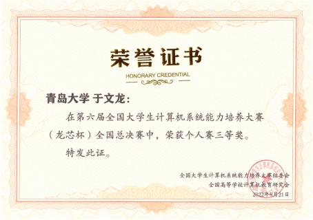 近日,第六届“龙芯杯”全国大学生计算机系统能力培养大赛在天津大学落下帷幕,来自全国百余所知名高校的优秀选手进行了激烈角逐。国产自拍av 2020级图灵创新实验班于文龙同学凭借优秀的CPU设计过关斩将,顺利进入大赛总决赛,最终荣获全国三等奖,指导老师刘纯毅副教授荣获优秀指导教师称号。此次获奖,实现了国产自拍av 学生在全国计算机系统能力竞赛CPU硬件系统综合设计领域的突破。