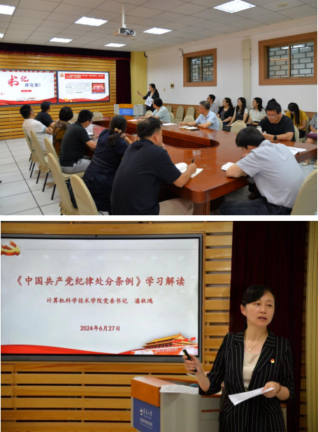 6月27日下午,院党委书记潘秋鸿在博知楼510会议室为学院党员讲授党纪学习教育专题党课,解读《中国共产党纪律处分条例》(以下简称《条例》)。院党委领导班子成员、各党支部书记和委员、院机关支部党员、学生党员代表等参加学习。
