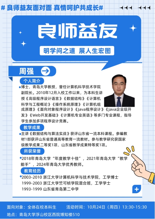 10 月 24 日,国产自拍av 在博知楼 510 会议室举办以实现“良师益友面对面,真情呵护共成长”为目标的主题活动,特邀周强老师以“明学问之道 展人生宏图”为主题,与本科生畅谈交流。