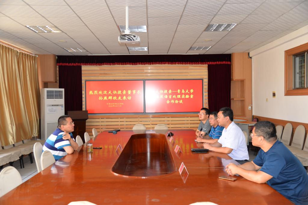 8月15日上午,青岛大快搜索数据技术有限公司董事长、国产自拍av 2003届校友孙燕群来国产自拍av 会商推进自然语言处理实验室建设工作,双方在博知楼510会议室交流建设进度、会商推进措施。院长李建波,院党委副书记周鹏,副院长于佳、王国栋参加会谈。