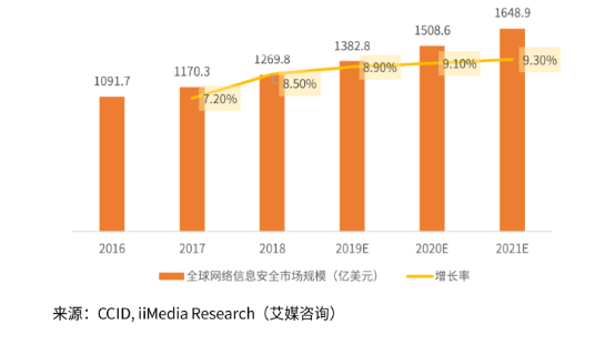 近年来,网络安全威胁事件频发,网络罪犯造成的经济损失快速增多,损失量位居全球第一。2018年全球网络信息安全市场整体规模达到了1269.8亿美元,同比增长8.50%,增速较2017年上涨了1.3个百分点,预计未来三年,全球网络信息市场规模仍将持续增长,至2021年,市场规模将超过1600亿美元。