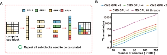 图1. CMS的多GPU并行架构和性能表现。(A)CMS通过负载均衡协调机制对计算任务进行分解,将子块任务尽可能均匀地分配至多个GPU,确保高并行计算效率。(B)多GPU的CMS与64核CPU及单GPU计算时间对比。在计算20万例微生物组样本的距离矩阵时, CPU需要近18天,单GPU也需要超过11小时,而CMS仅需1.5小时,计算速度较CPU提升了280倍。
