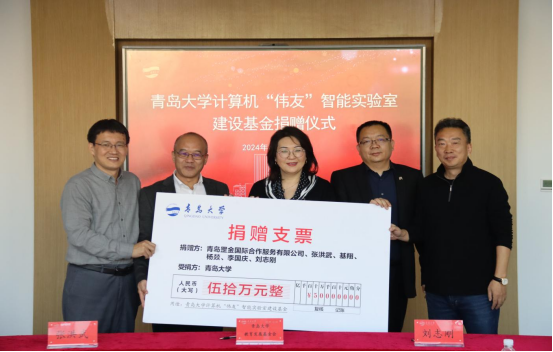 刘恩贤代表学校向青岛罡金国际合作服务有限公司以及刘志刚、张洪武、基翔、李国庆、杨燚5位校友的慷慨捐赠表示衷心的感谢。刘恩贤表示,校友的成就是母校的光荣,校友的关心是母校发展的力量、校友对母校的感情就是对人才培养质量最好的认可。青岛罡金国际合作有限公司和5位校友共同捐资设立计算机“伟友”智能实验室建设基金,助推学生创新实践能力的提升,是青大人“反哺母校、回报社会”的情怀和义举,他们的奋斗故事和捐助母校建设的行动,是学校最生动、最直接的德育教材,将引领更多的青大人关心支持母校事业的发展。